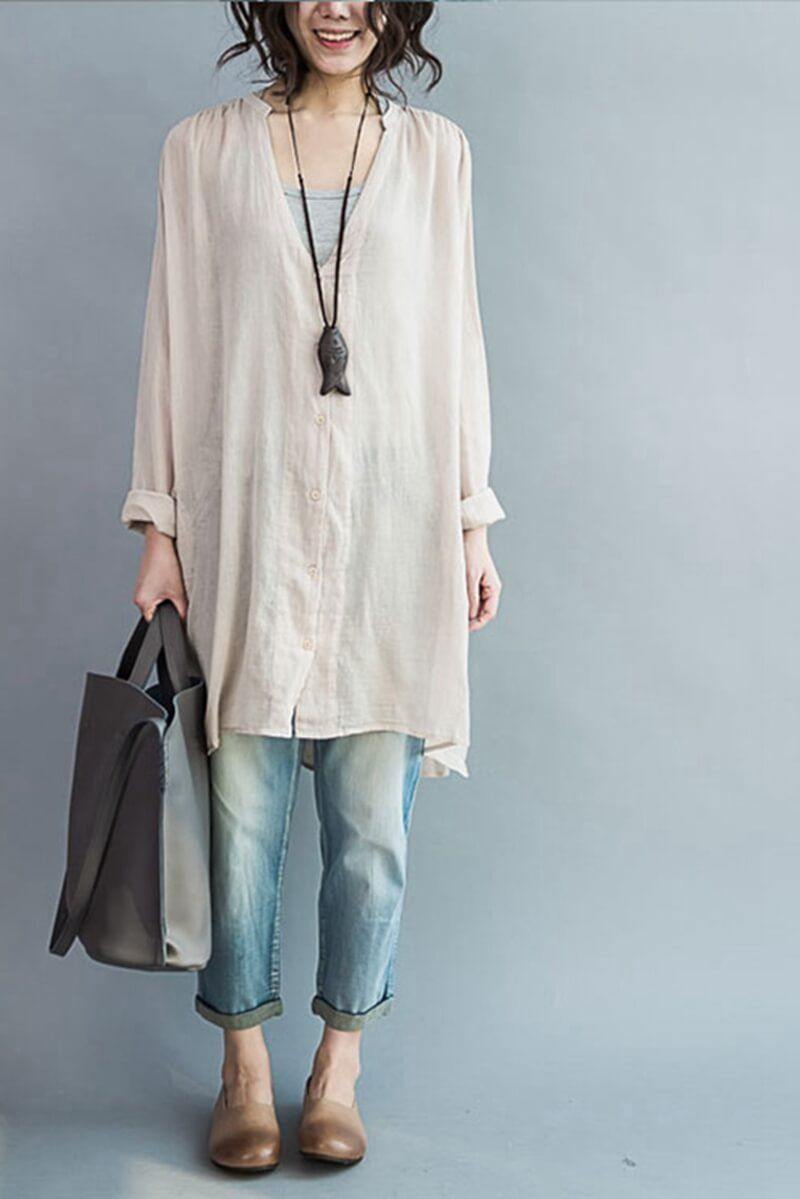 Art Casual Loose Long V-neck Cotton Shirt Women Clothes