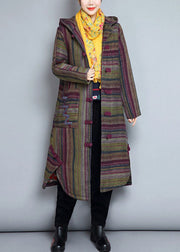 Women Khaki Hooded Pockets Striped Fine Cotton Filled Women Witner Coats