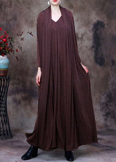 Loose Brown V Neck Fake Two Pieces Silk Long Dresses Long Sleeve