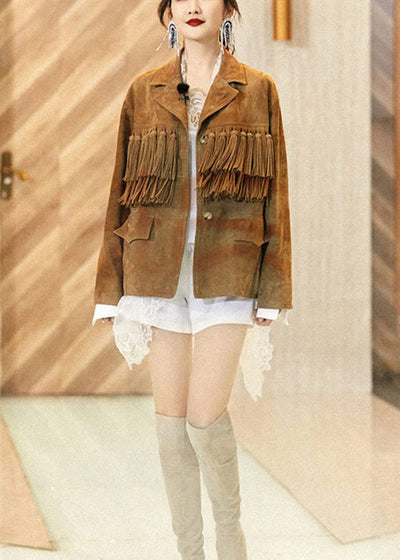 French Khaki Tasseled Button Patchwork Faux Suede Coats Fall