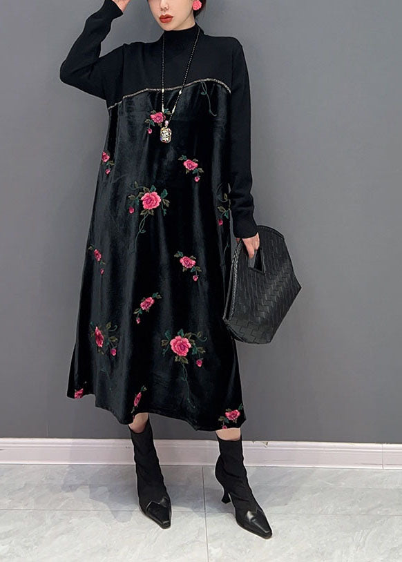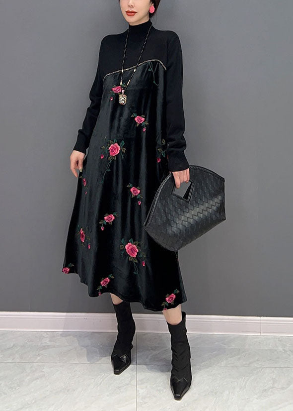 Women Black High Neck Embroideried Knit Patchwork Silk Velour Dress Spring