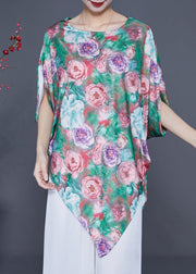 Unique Green Asymmetrical Floral Print Silk Tank Batwing Sleeve