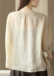 Boho Apricot O-Neck Embroideried Low High Design Ramie Shirts Summer