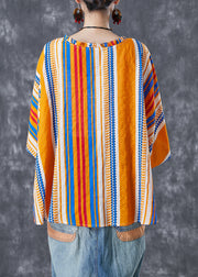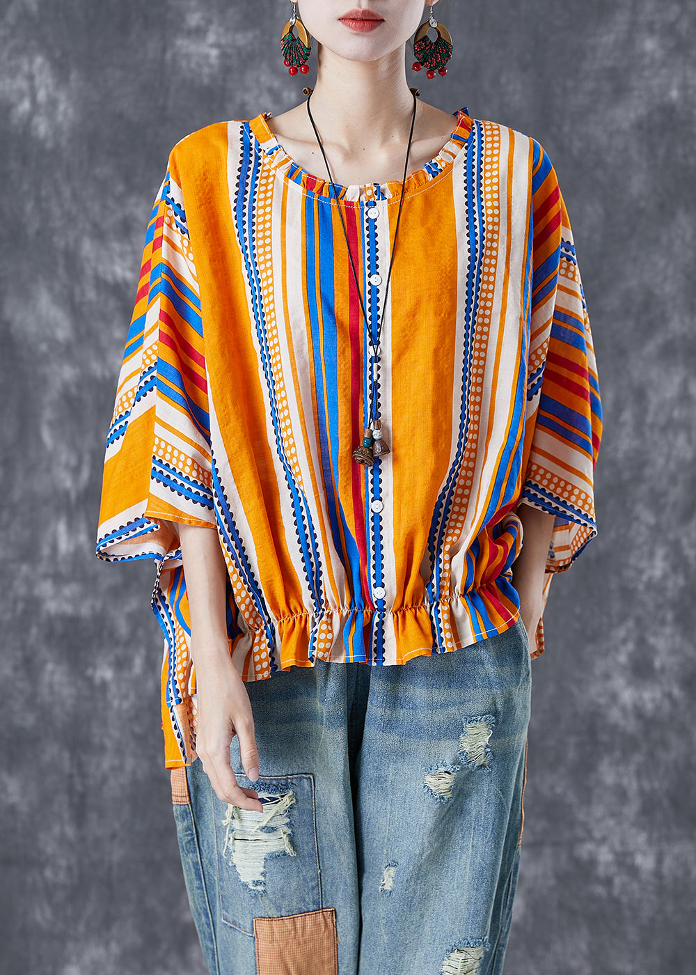 Bohemian Yellow Oversized Striped Wrinkled Cotton Shirt Batwing Sleeve