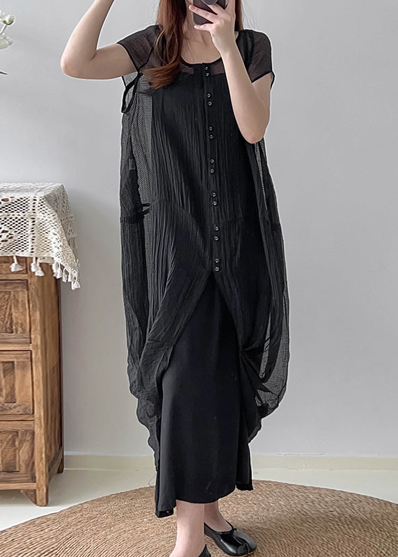Vintage Black Asymmetrical Wrinkled Silk Dress Two Piece Set Summer