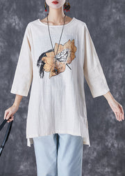 Beige Print Linen Tops Low High Design Fall