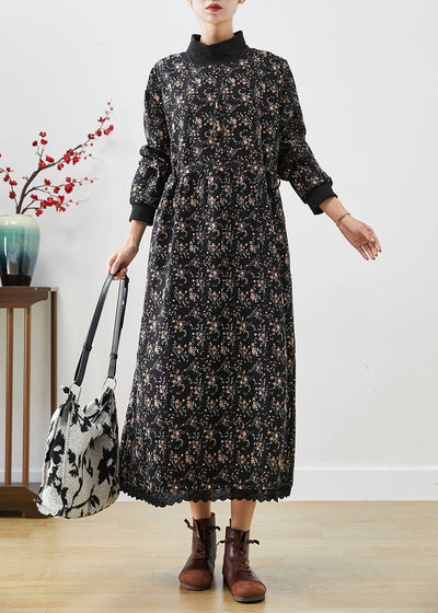 Bohemian Black Turtle Neck Print Warm Fleece Long Dress Winter