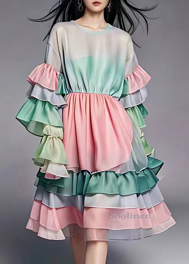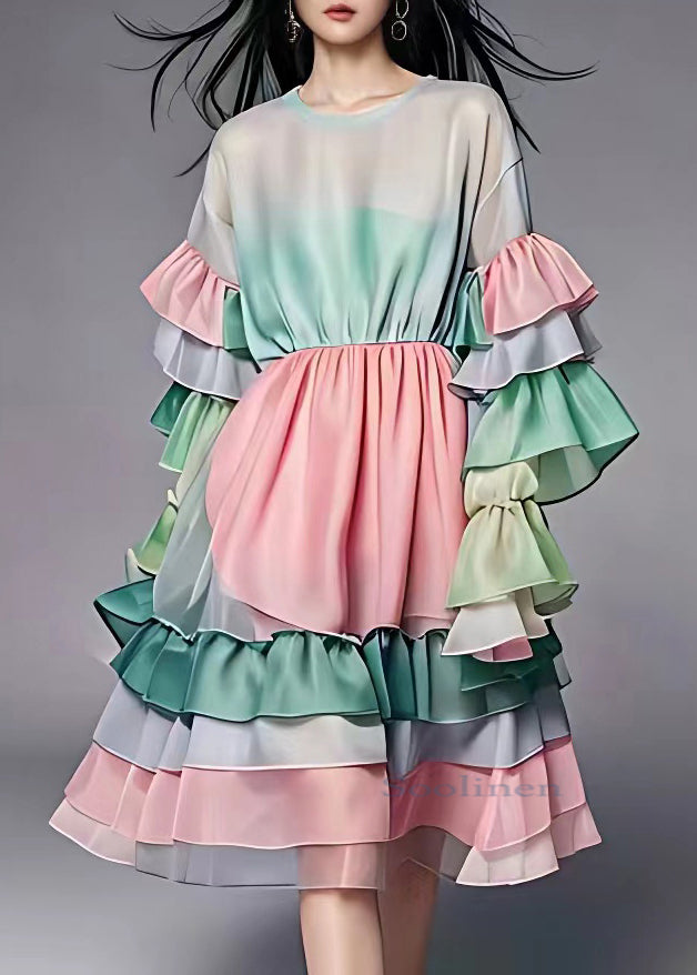 Fitted Gradient Color Wrinkled Patchwork Chiffon Mid Dresses Long Sleeve