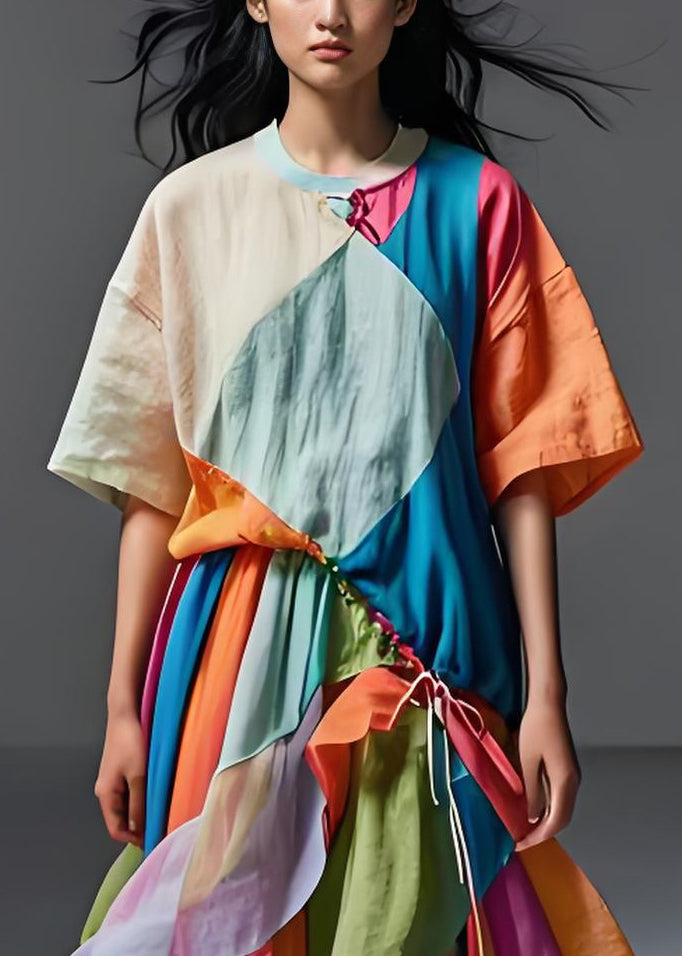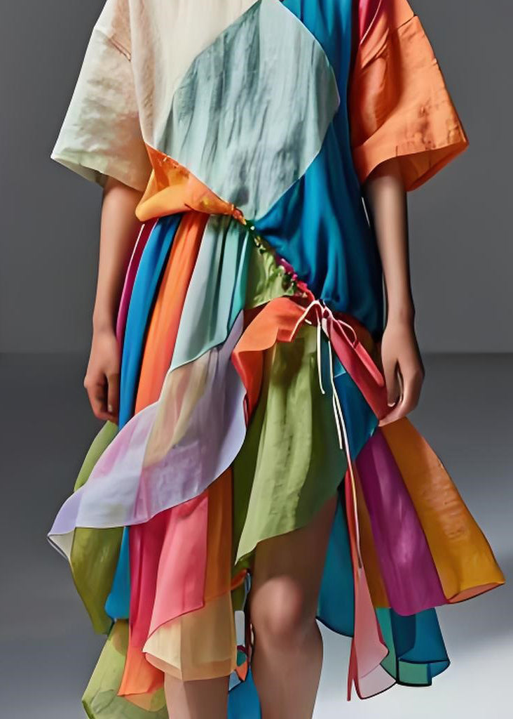French Colorblock Cinched Asymmetrical Patchwork Cotton Dress Summer