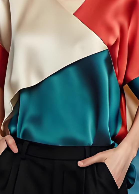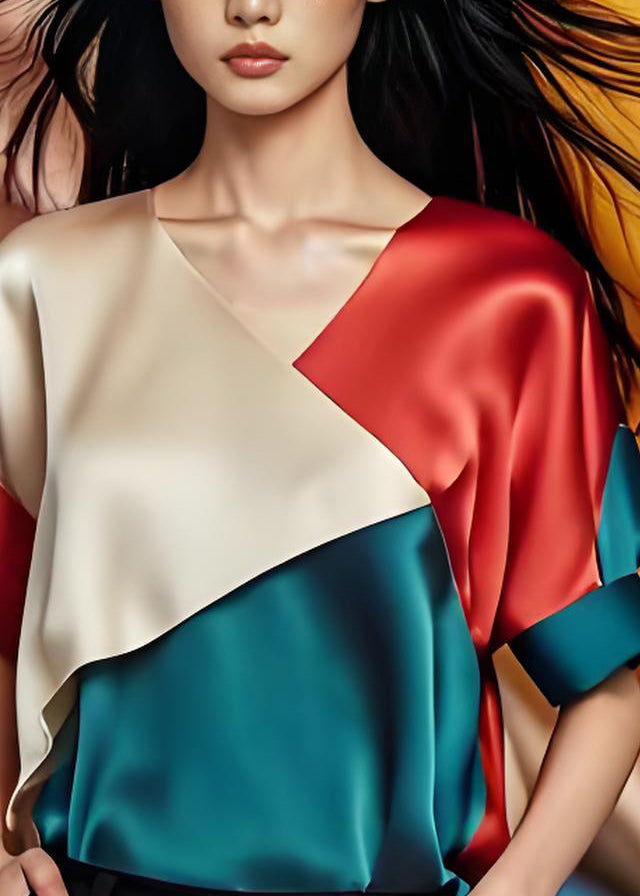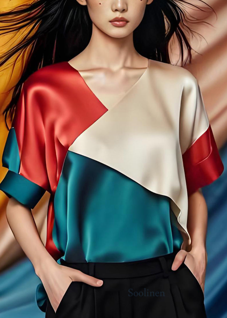Simple Colorblock V Neck Patchwork Silk Tops Summer