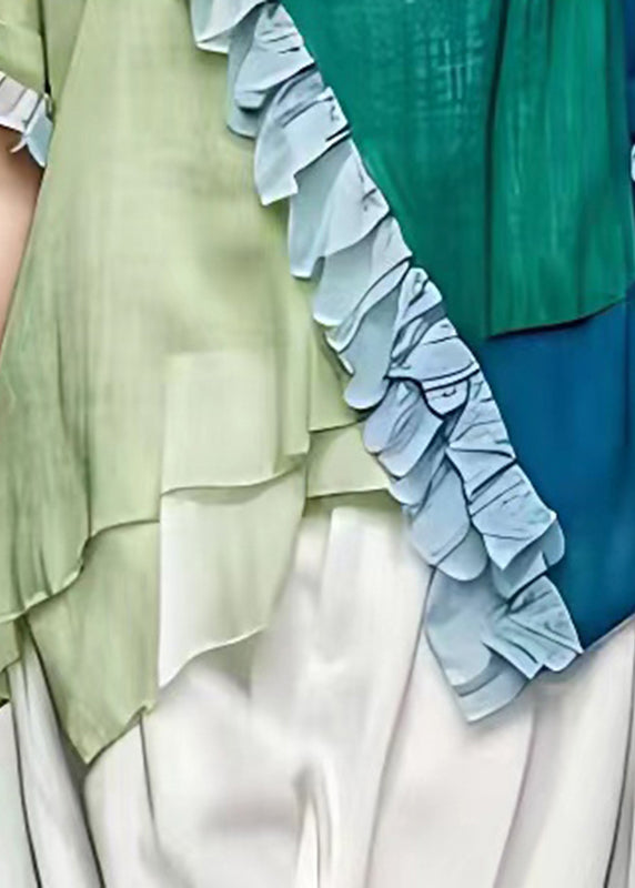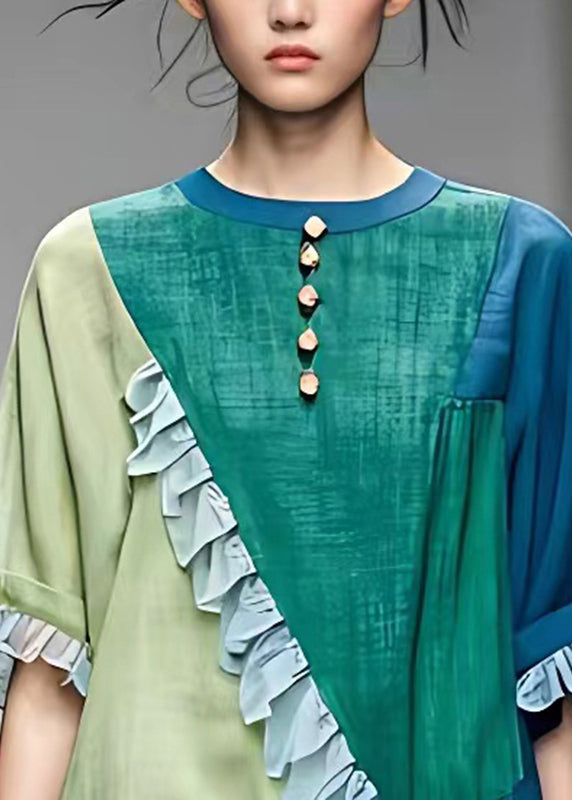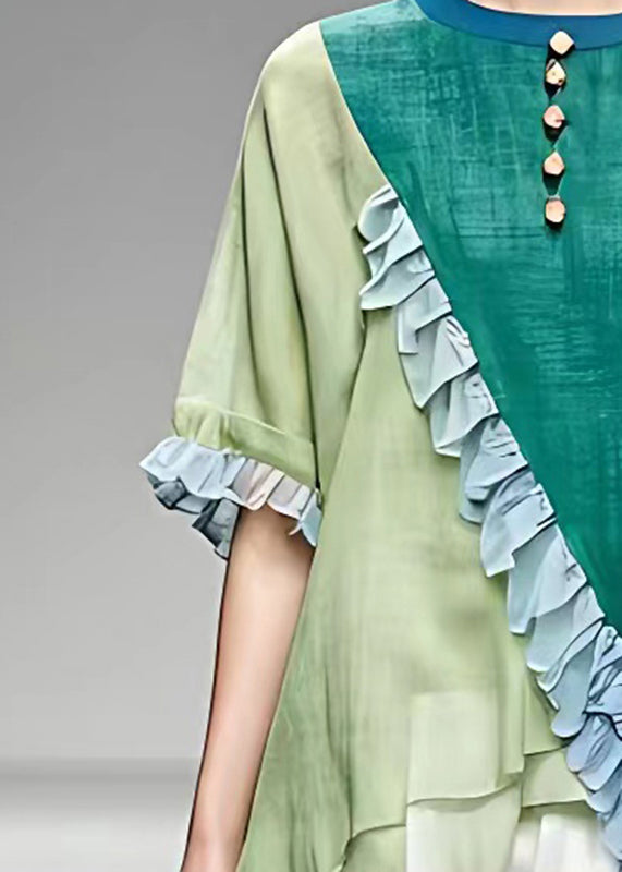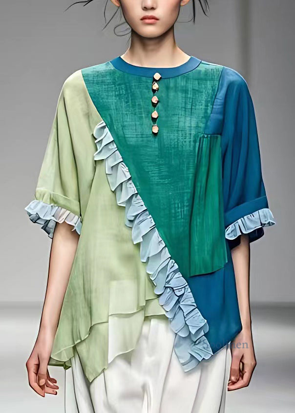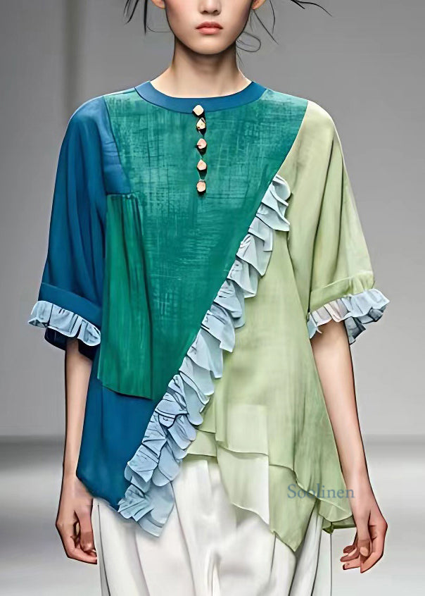 Women Colorblock O-Neck Asymmetrical Ruffled Button Top Short Sleeve