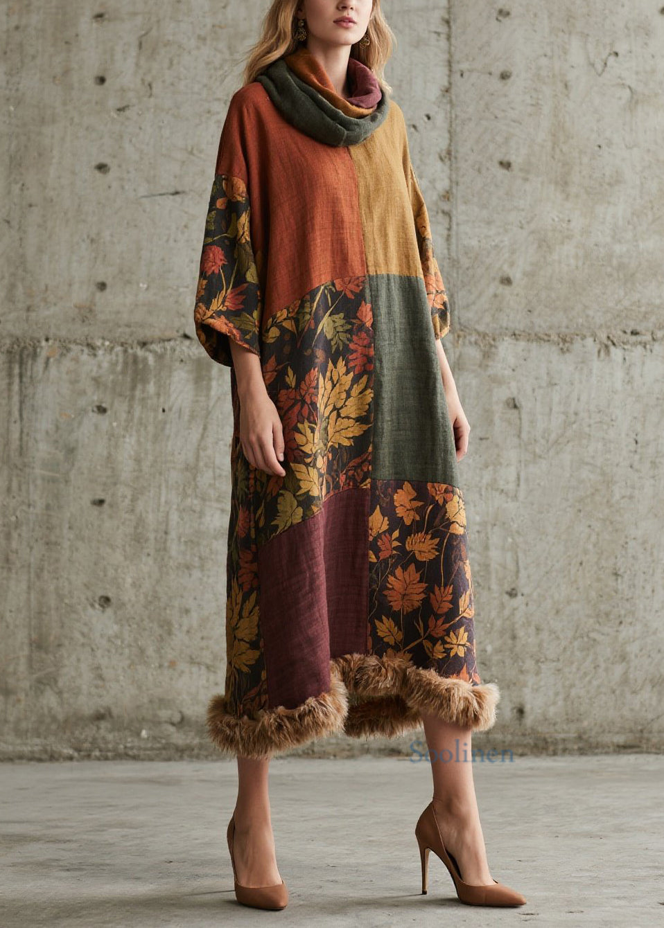 New Colorblock Print Fuzzy Fur Patchwork Cotton Long Dress Fall
