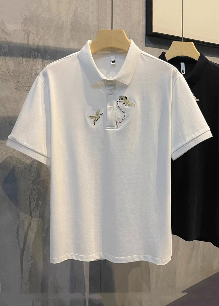 New White Peter Pan Collar Embroideried Cotton Mens T Shirt Summer
