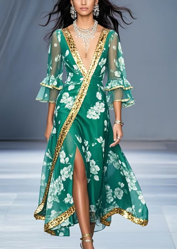 Vintage Green V Neck Print Chiffon Holiday Dress Flare Sleeve