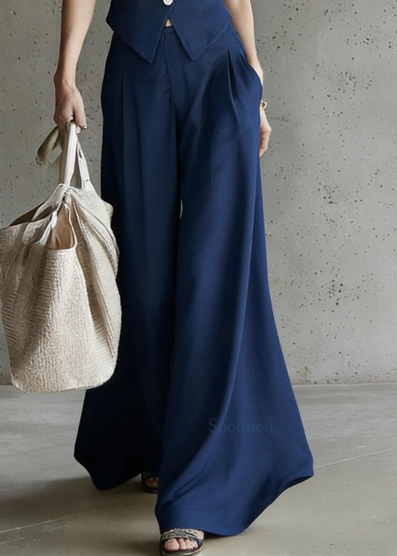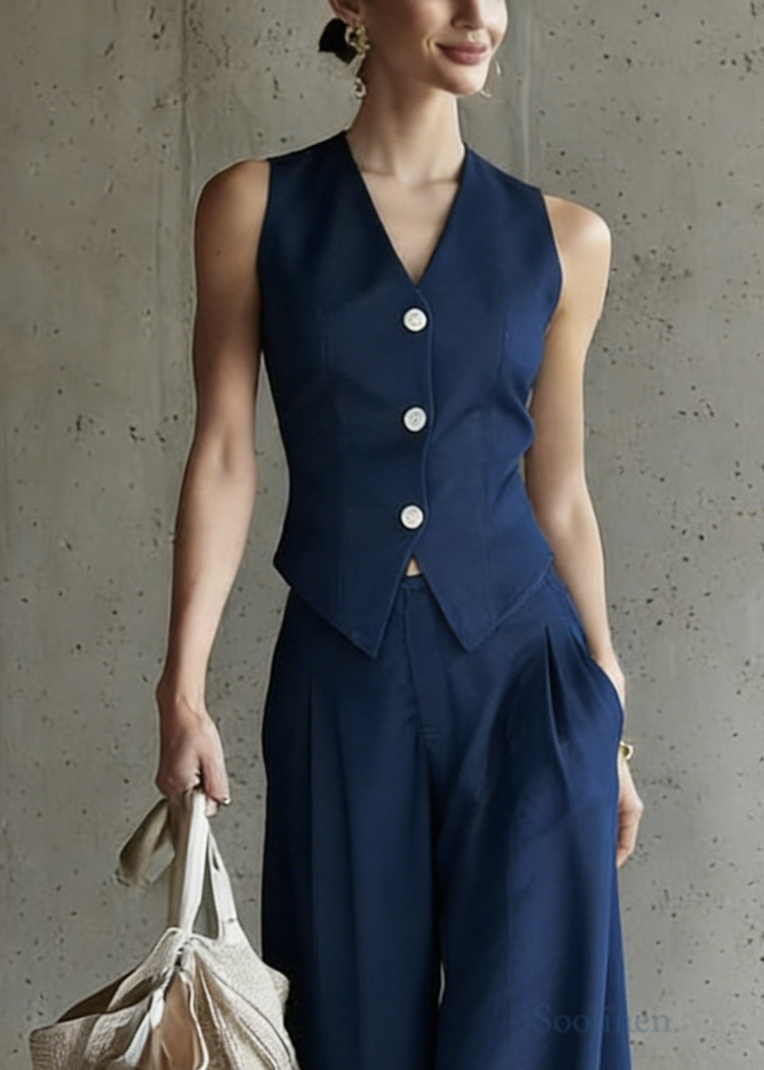 Modern Blue V Neck Button Waistcoat And Wide Leg Pants Two Pieces Set Sleeveless