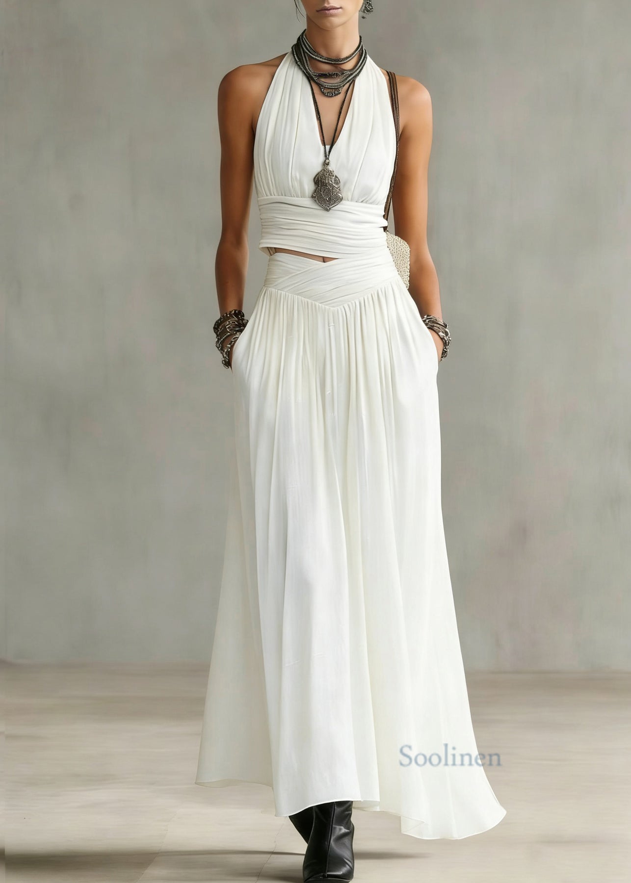 Natural White V Neck Wrinkled Top And Maxi Skirts Two Pieces Set Summer