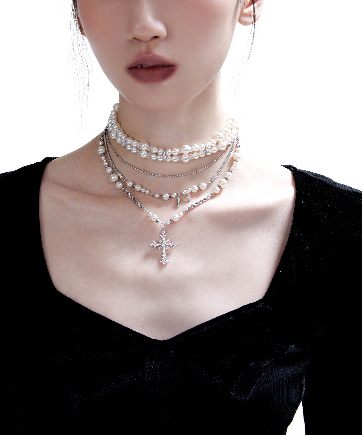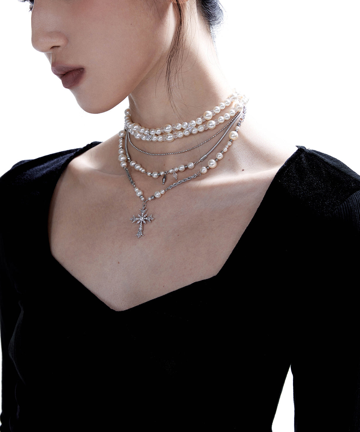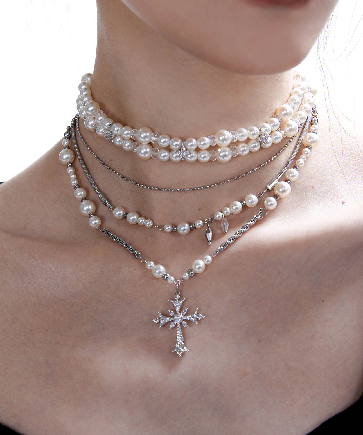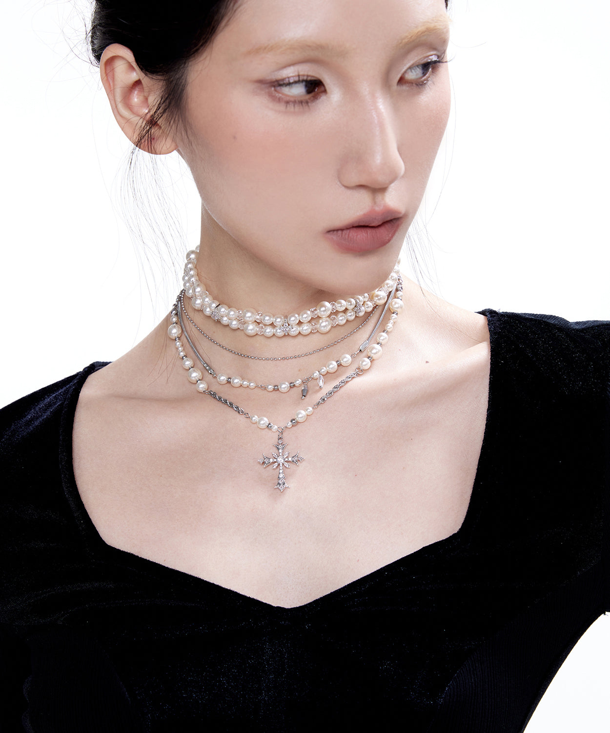 Vintage Pearl Cross Two Piece Set Alloy Layering Pendant Necklace