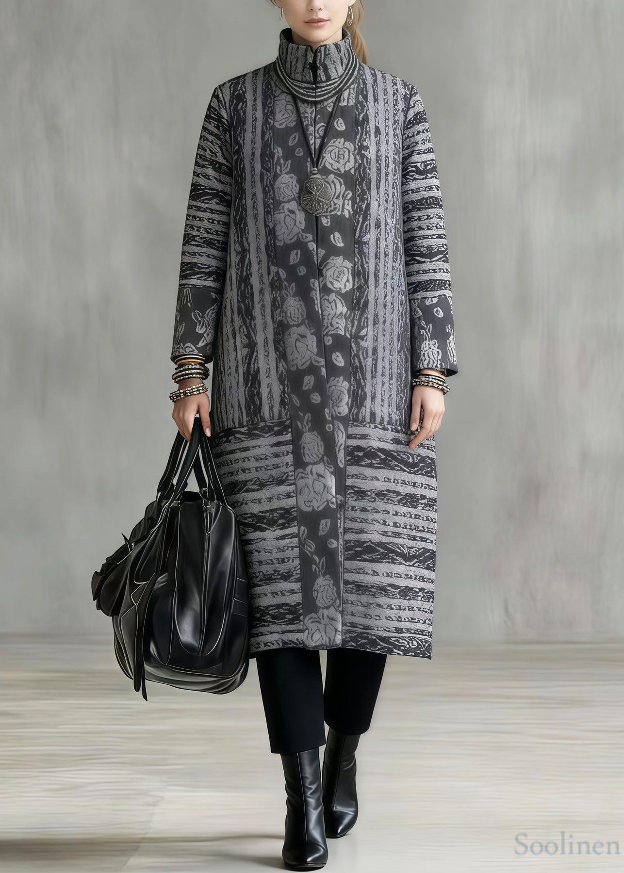 Art Grey Stand Collar Print Fine Cotton Filled Winter Coats