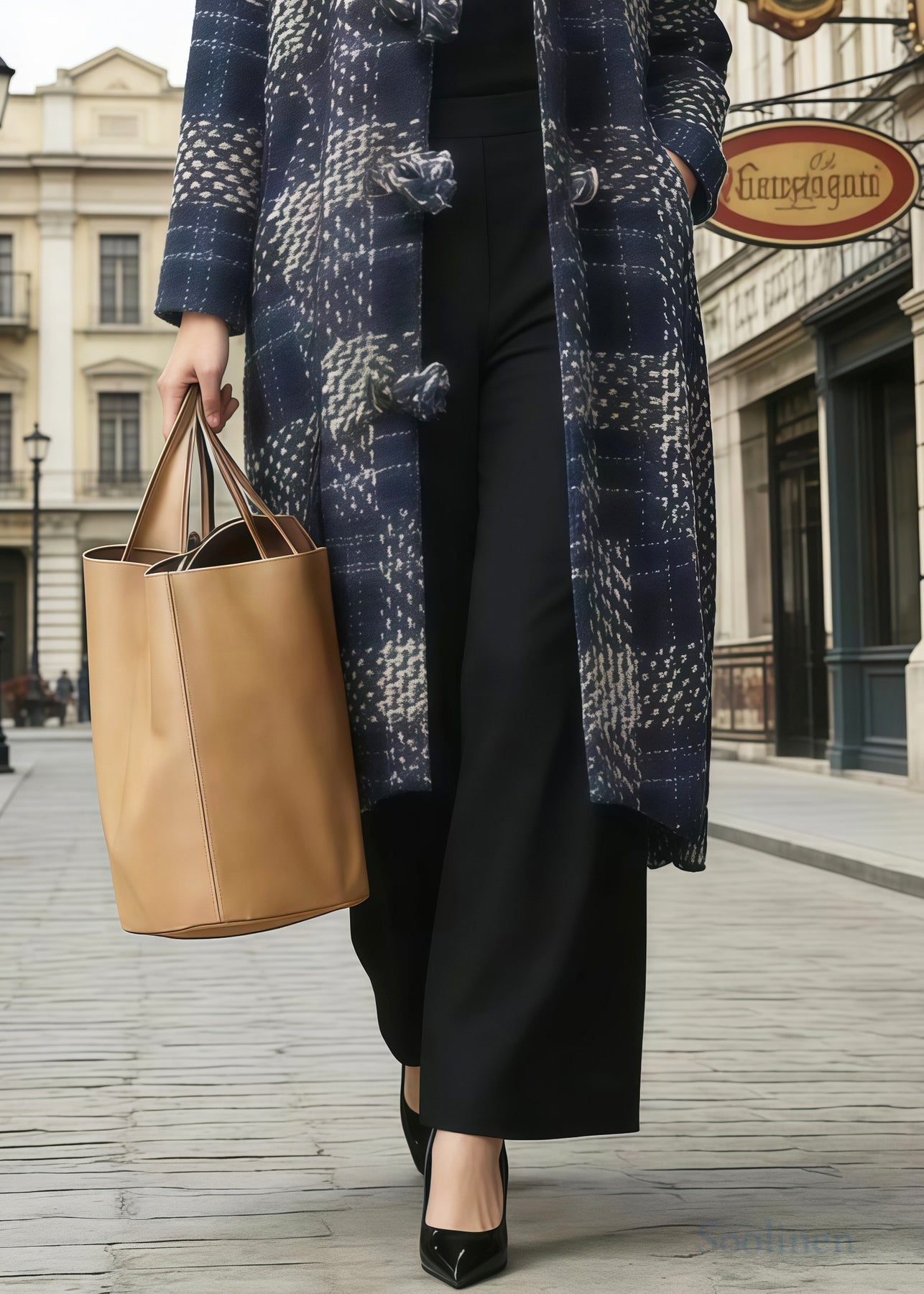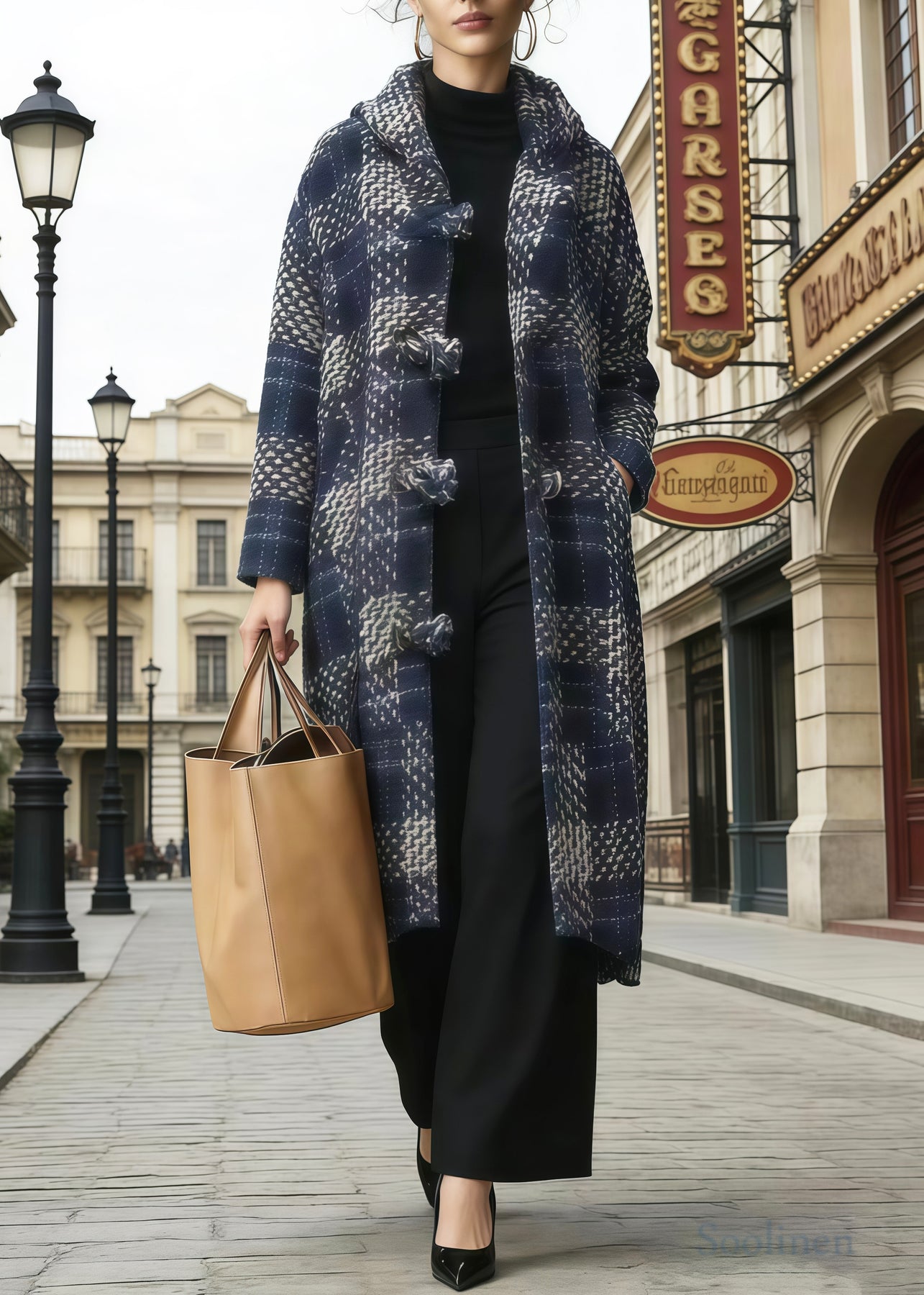 Simple Navy Hooded Plaid Chinese Button Woolen Coat Winter