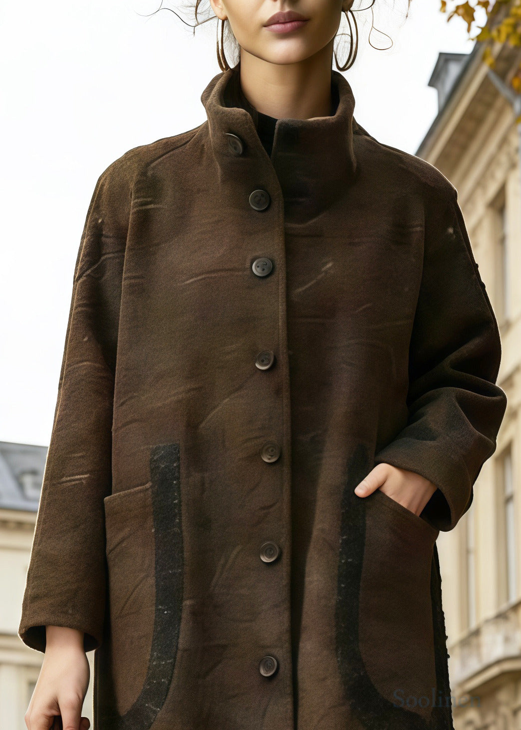 Vintage Brown Stand Collar Pockets Woolen Trench Winter