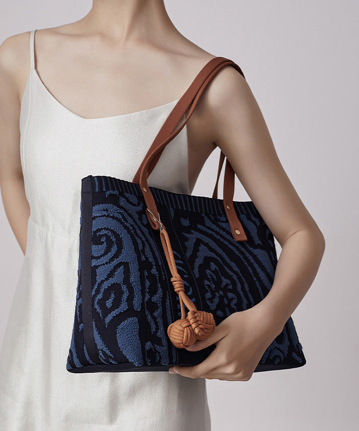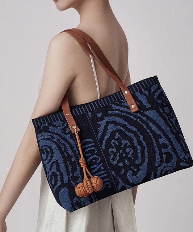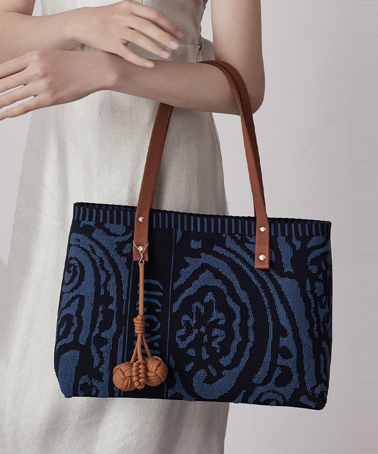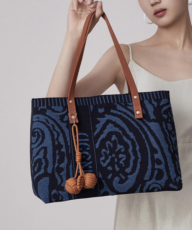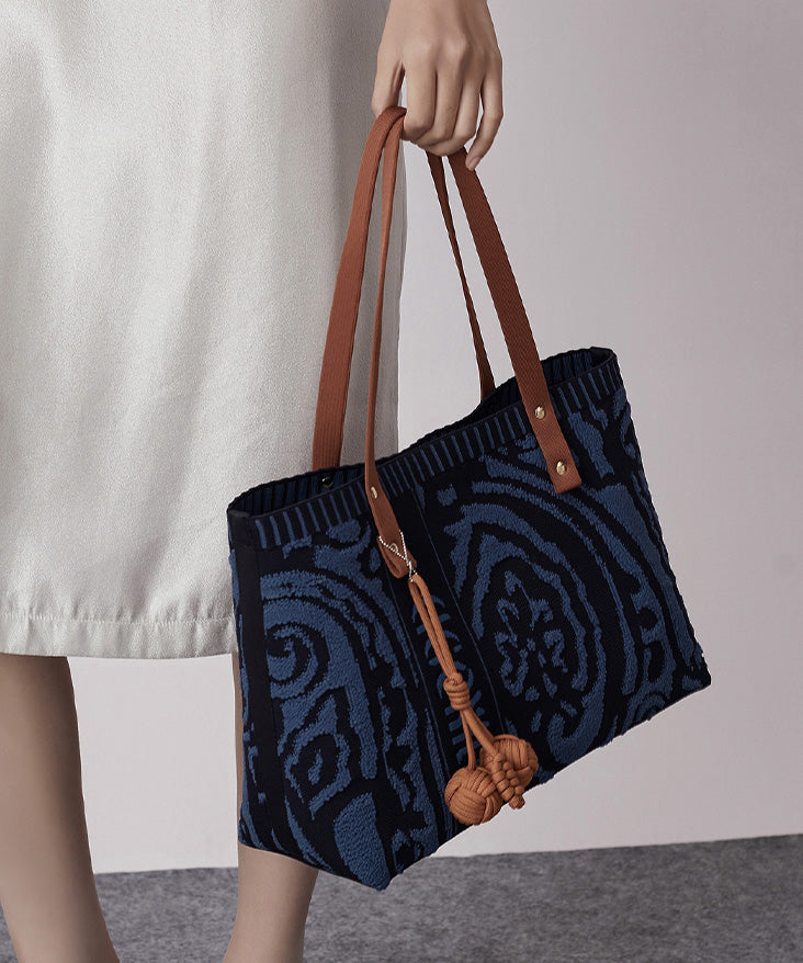 Vintage Navy Jacquard Large Capacity Cotton Satchel Handbag