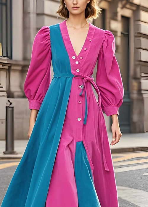 Boutique Rose V Neck Tie Waist Patchwork Corduroy Dress Fall