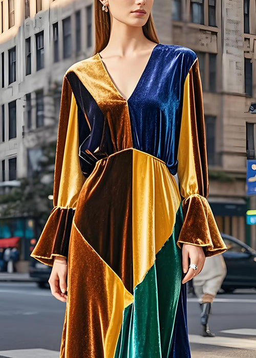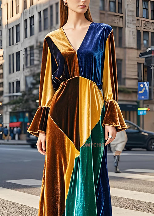 French Colorblock V Neck Patchwork Velvet Long Dresses Flare Sleeve