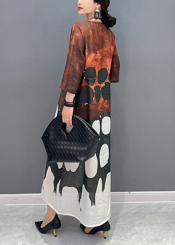 Vintage O-Neck Cinched Print Long Dress Bracelet Sleeve
