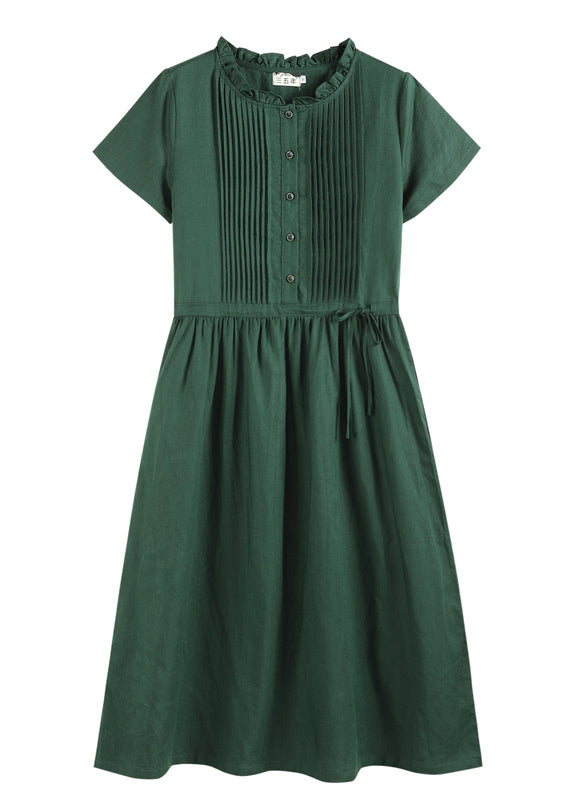 Beautiful Blackish Green Ruffled Wrinkled Drawstring Cotton Dress Short Sleeve
