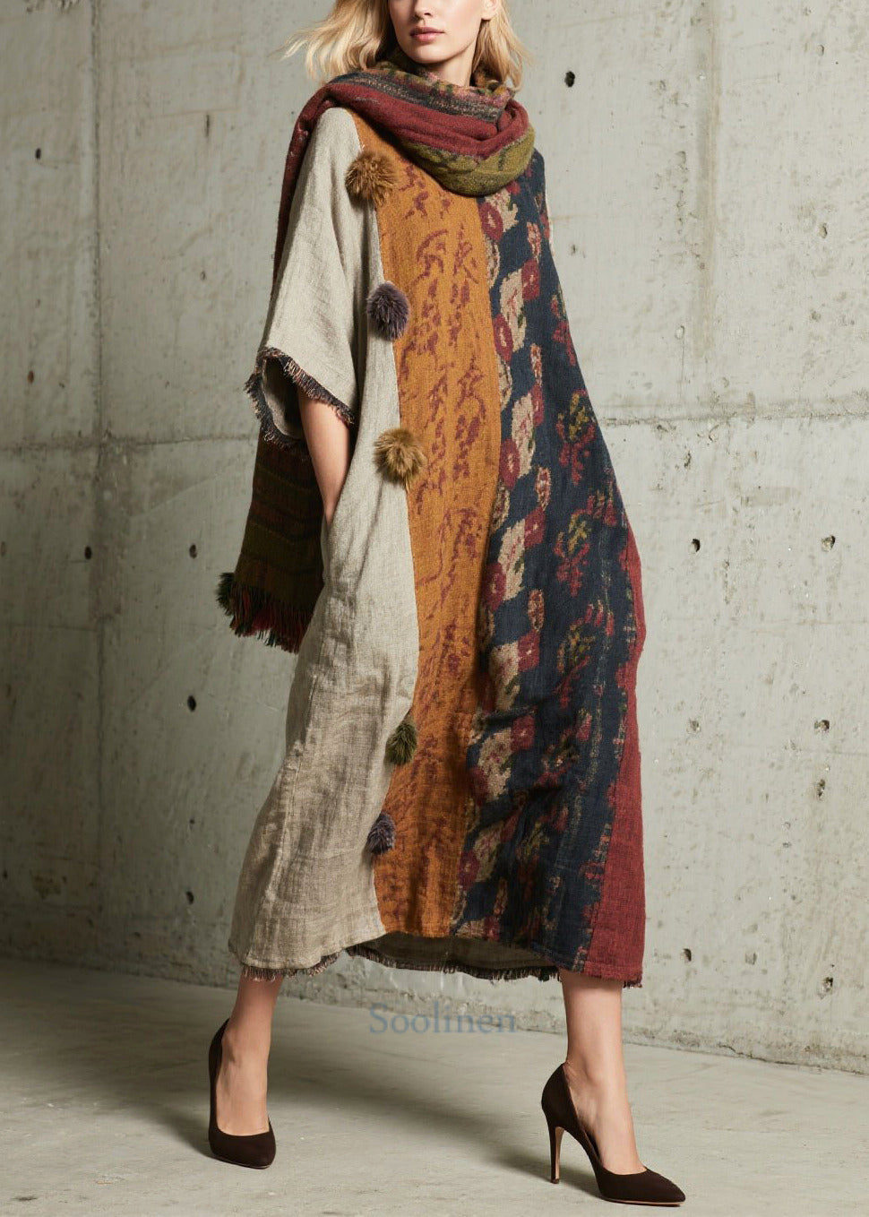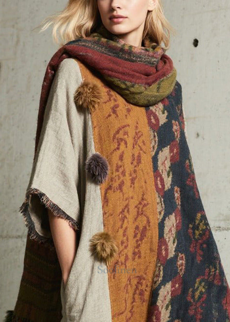 Boho Oversized Patchwork Fuzzy Ball Decorated Dress Half Sleeve
