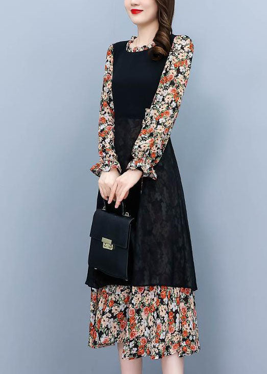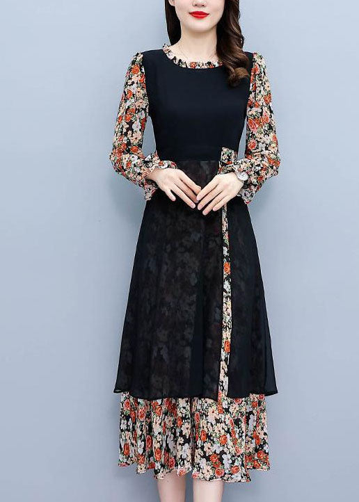 Elegant Colorblock O-Neck Patchwork Print Chiffon Dresses Fall