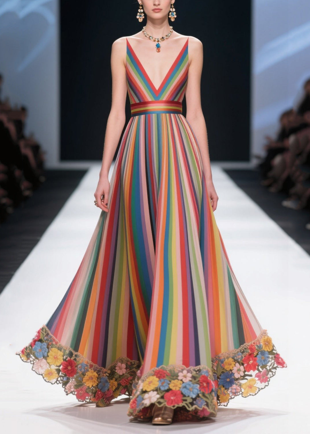 Fine Rainbow Striped Patchwork Multicolor Flower Chiffon Tunic Dress Summer