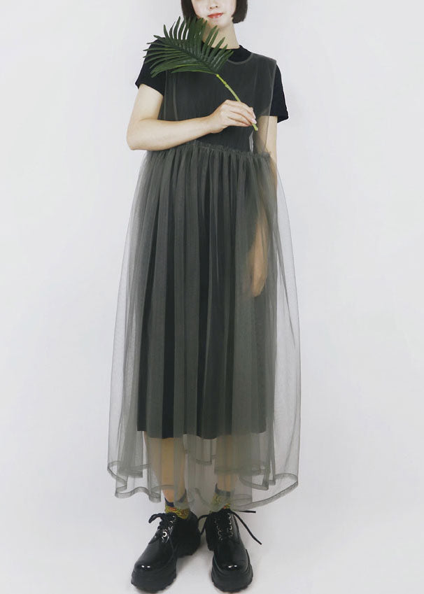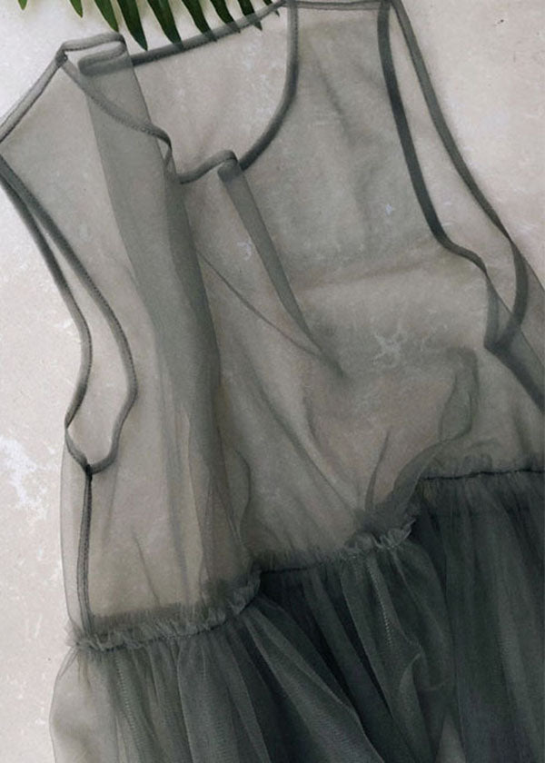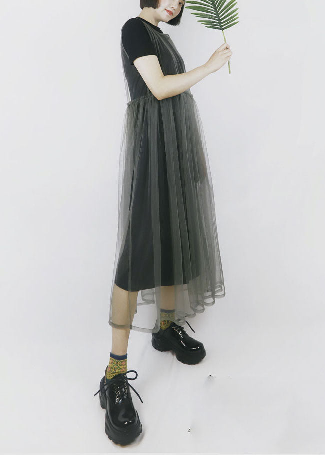 Modern Solid Color Grey O-Neck Patchwork Tulle Dress Long Smock Sleeveless