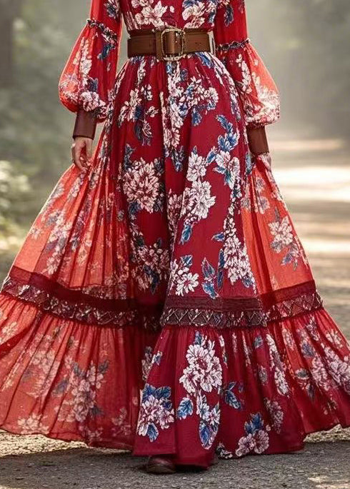 Stylish Red Print Exra Large Hem Cotton Vestidos Dress Lantern Sleeve