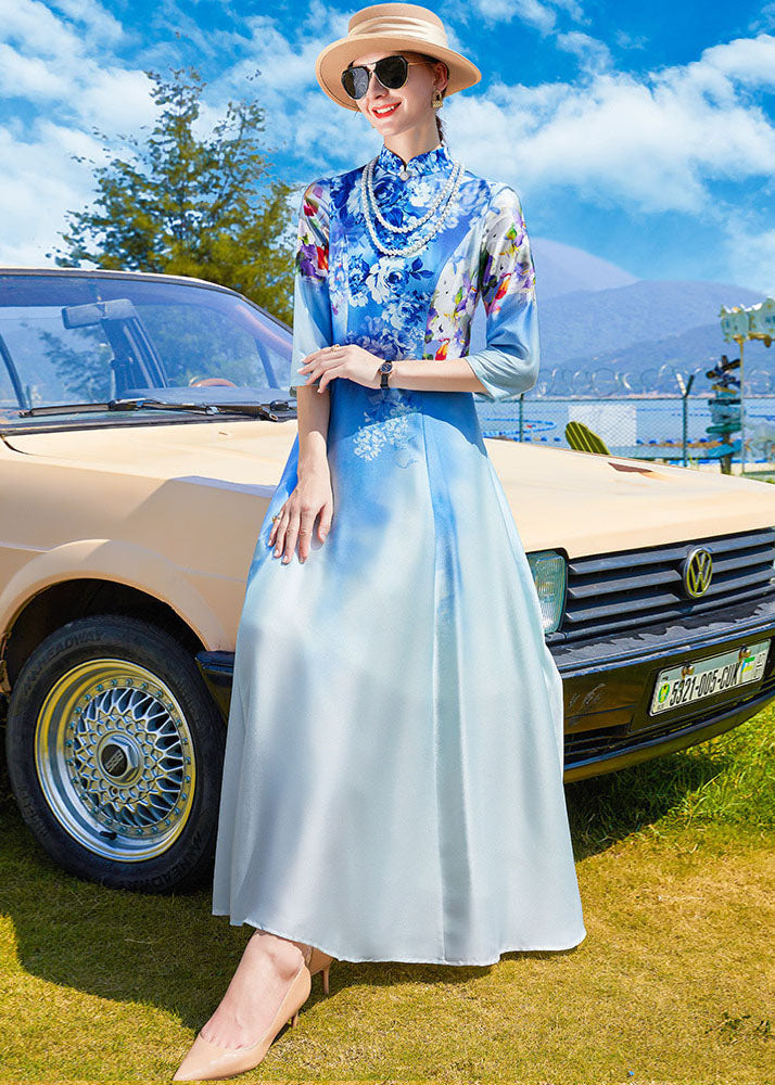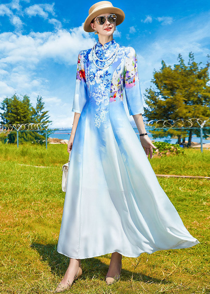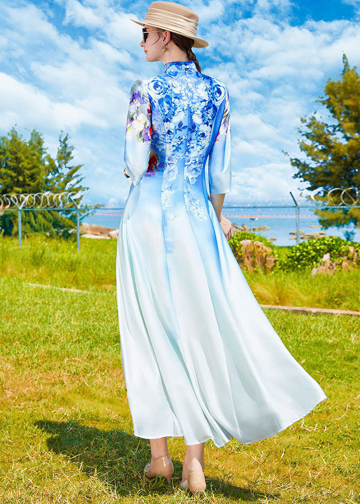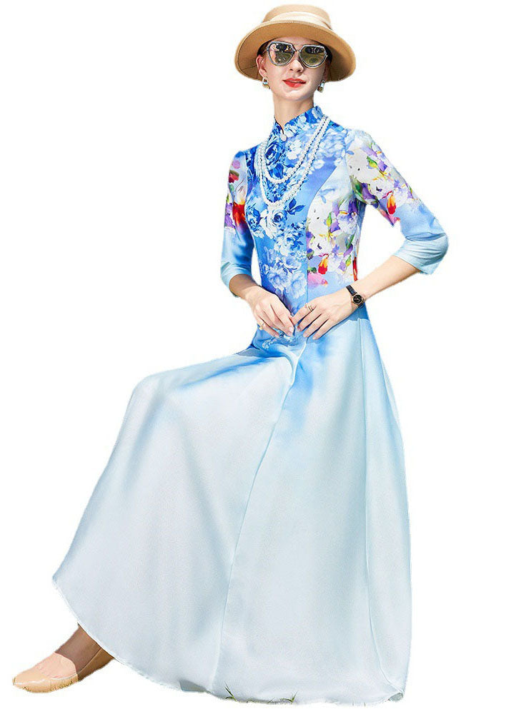 Vintage Sky Blue Stand Collar Print Exra Large Hem Silk Dress Cheongsam Bracelet Sleeve