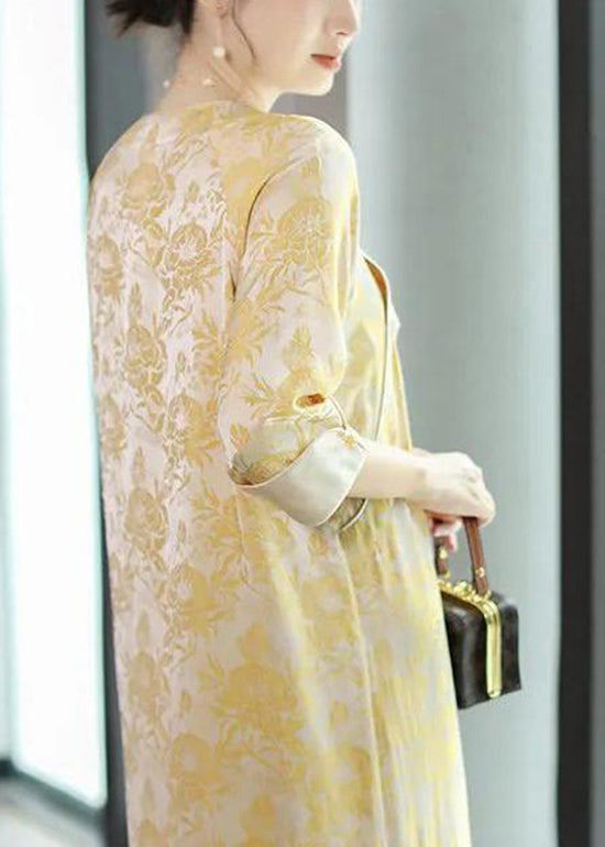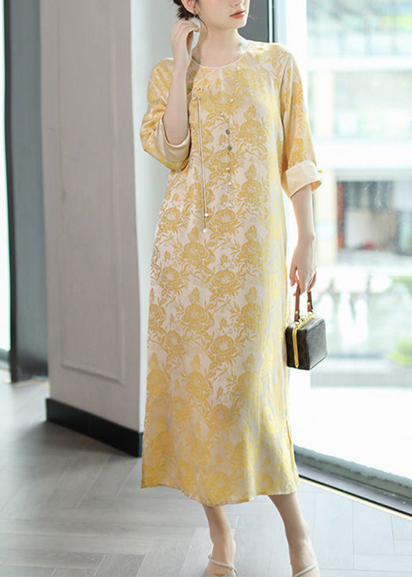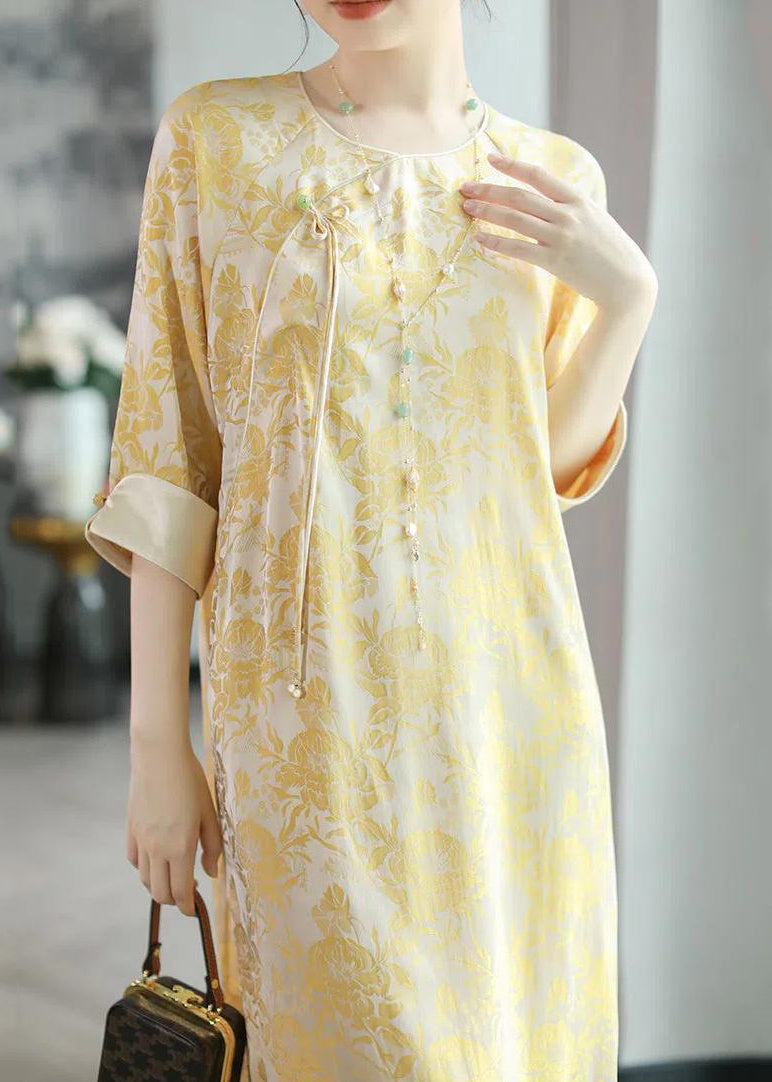 Vintage Yellow O Neck Tasseled Print Silk Dress Bracelet Sleeve