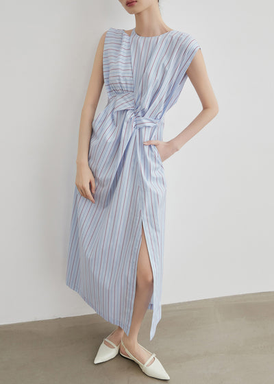 Chic Striped Hollow Out Side Open Cotton Long Dress Sleeveless