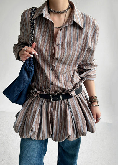 French Striped Ruffled Button Sashes Cotton Shirts Dress Fall