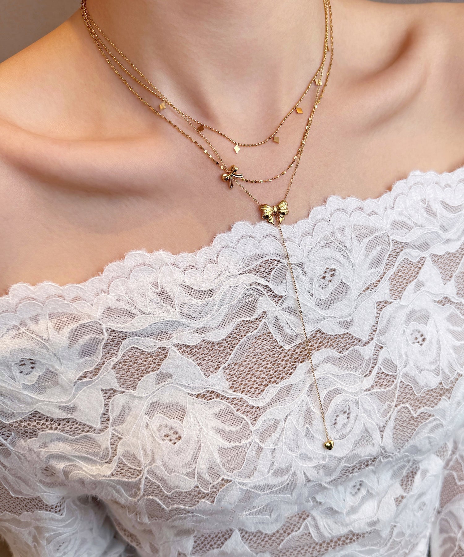 Fine Gold Bow Tassel Layering Alloy Two Piece Set Necklace