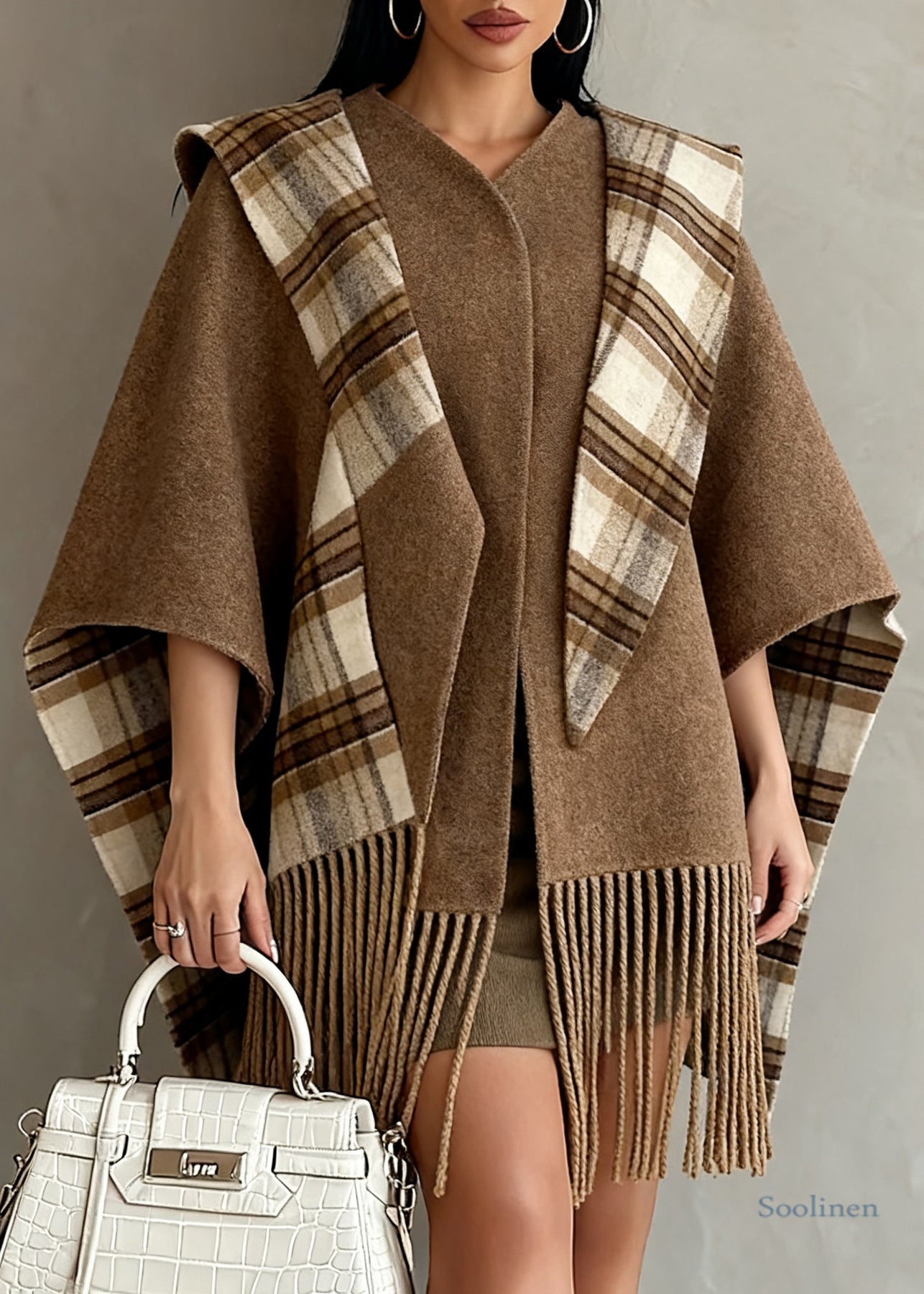 Italian Brown Tasseled Plaid Wear On Both Sides Woolen Cape Coats Spring