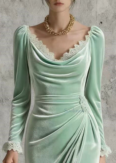 Silm Fit Light Green Lace Patchwork Wrinkled Silk Velvet Long Dress Spring