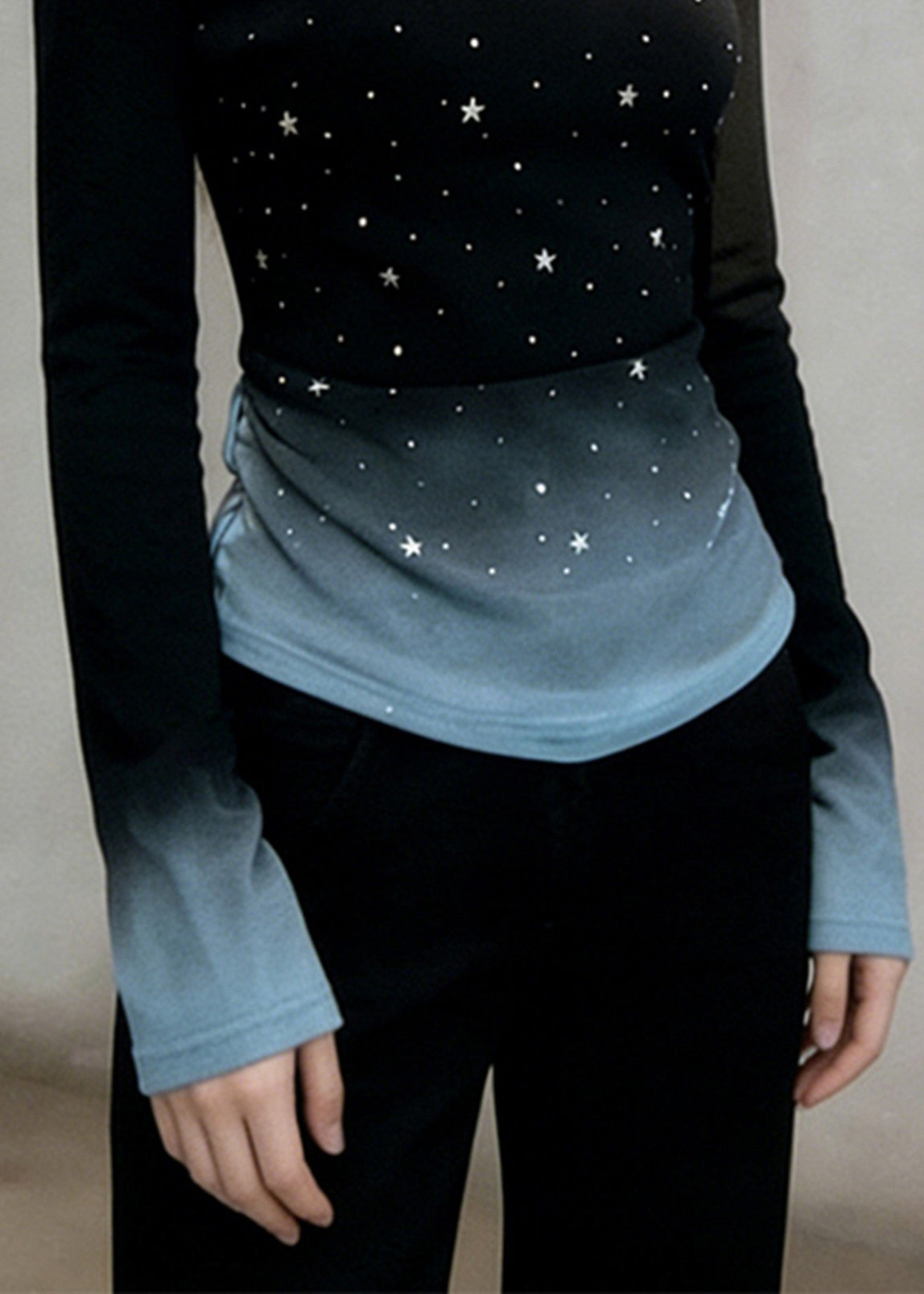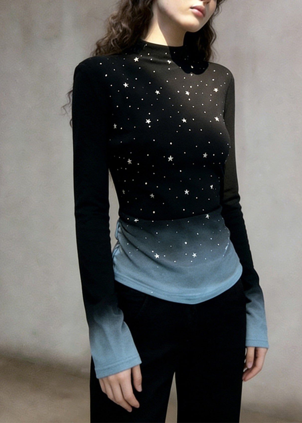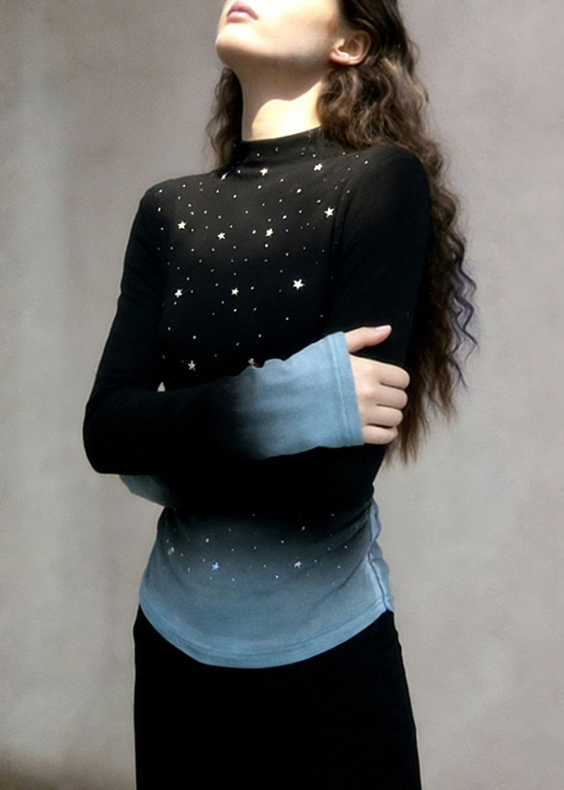 Stylish Black Gradient Color Zircon Cotton T Shirts Spring