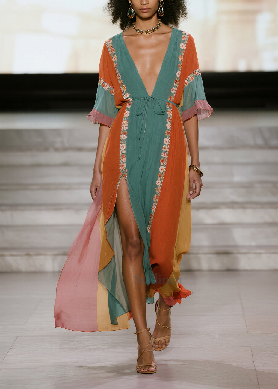 Blue Striped Draping Chiffon Beach Dress Tie Waist Side Open Summer