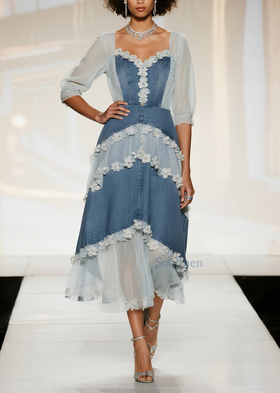 Modern Denim Blue Flower Patchwork Tulle Maxi Dresses Summer