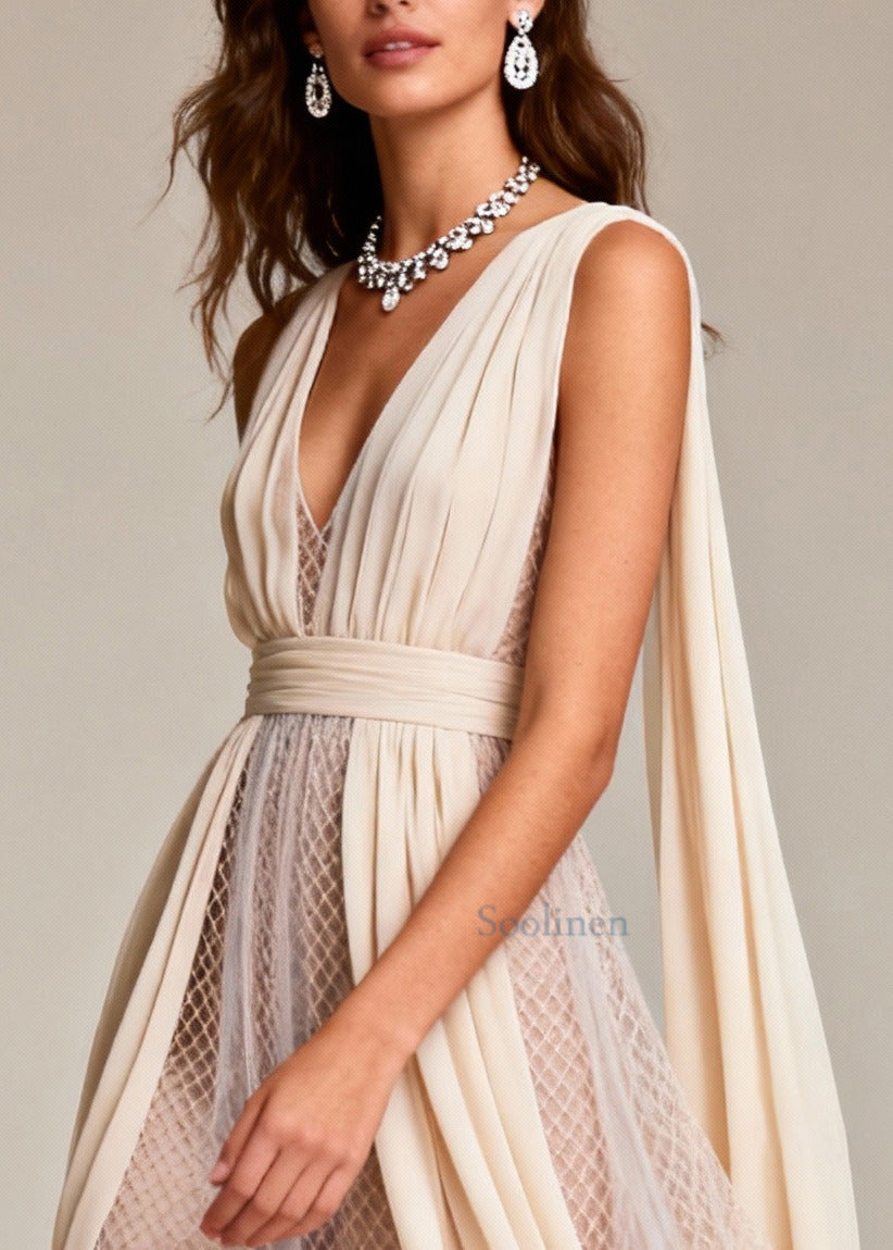 Women Beige Hollow Out Patchwork Tulle Evening Dress Summer