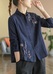 Navy Slim Fit Cotton Shirt Turn-down Collar Embroideried Spring