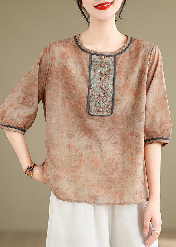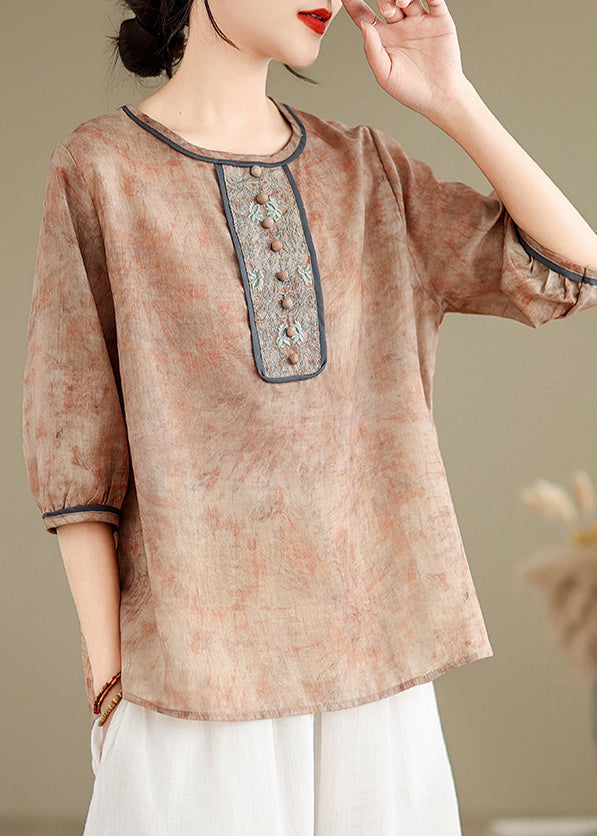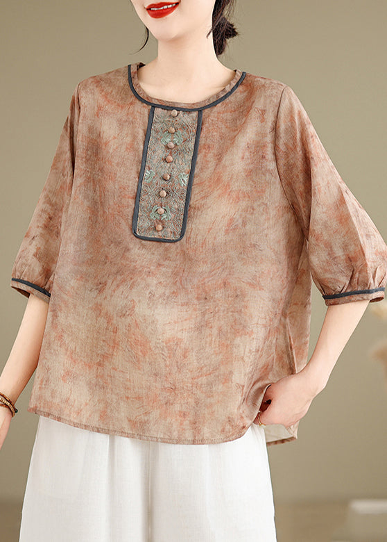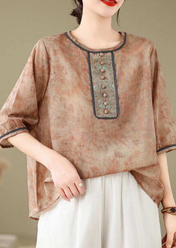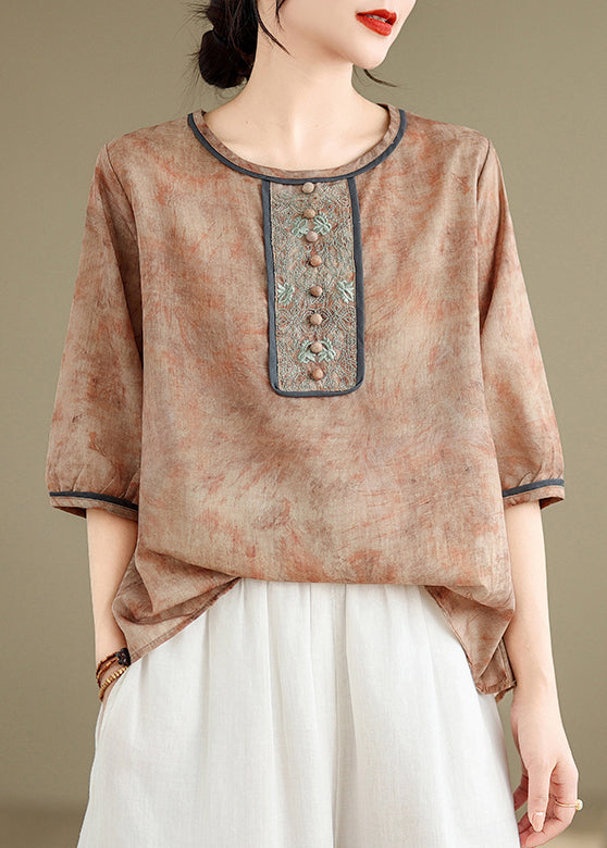 Fine Khaki Embroidered Tie Dye Linen Top Summer