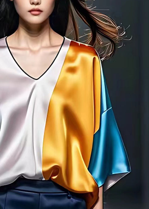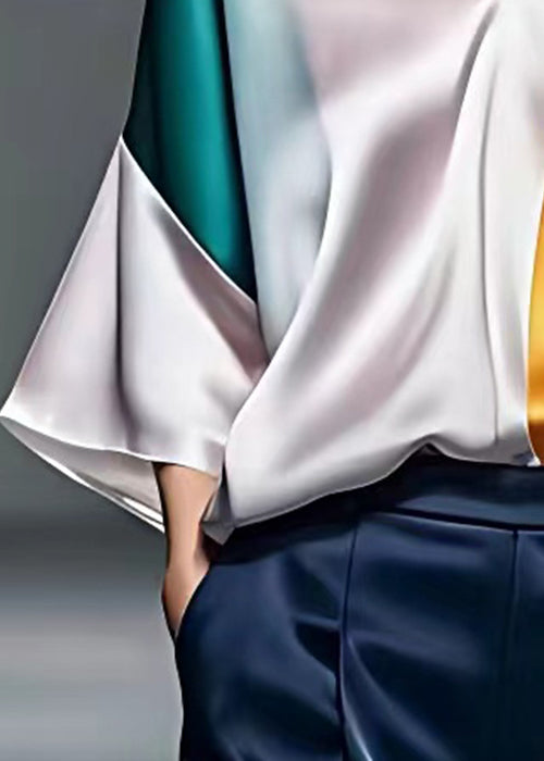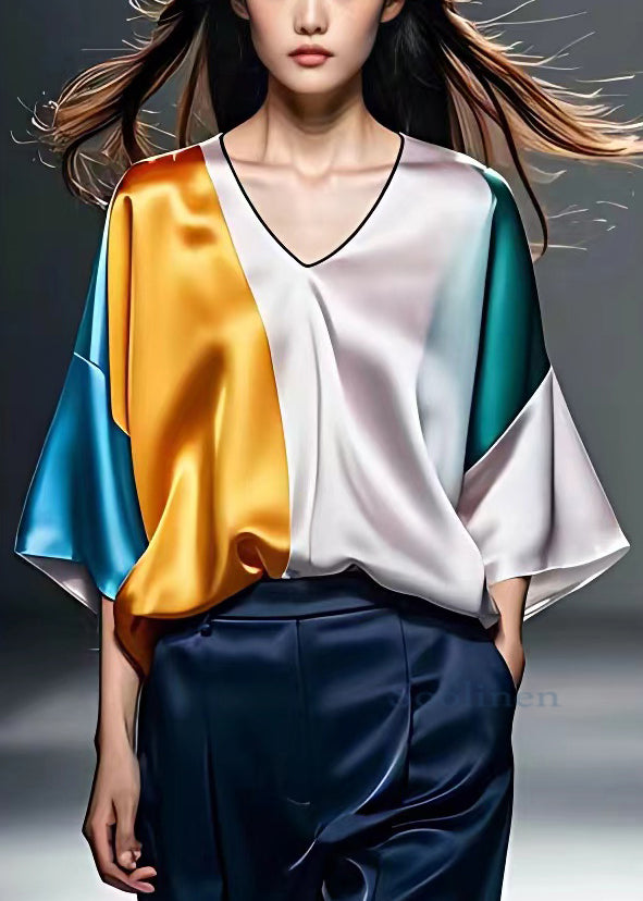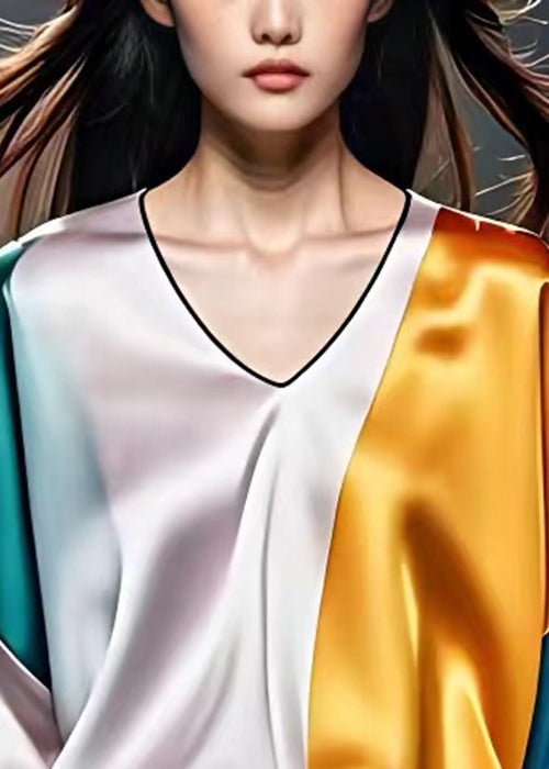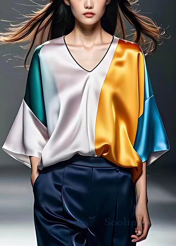 New Colorblock V Neck Patchwork Silk Shirt Bracelet Sleeve