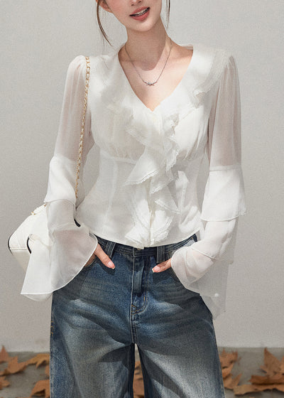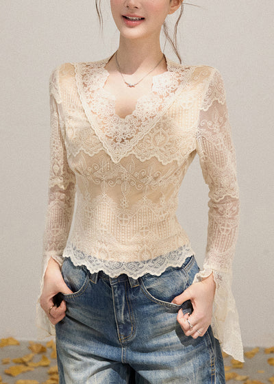 Sexy Beige V Neck Patchwork Lace Shirt Flare Sleeve