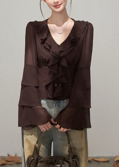 Silm Fit Brown Ruffled Chiffon Shirts Fall